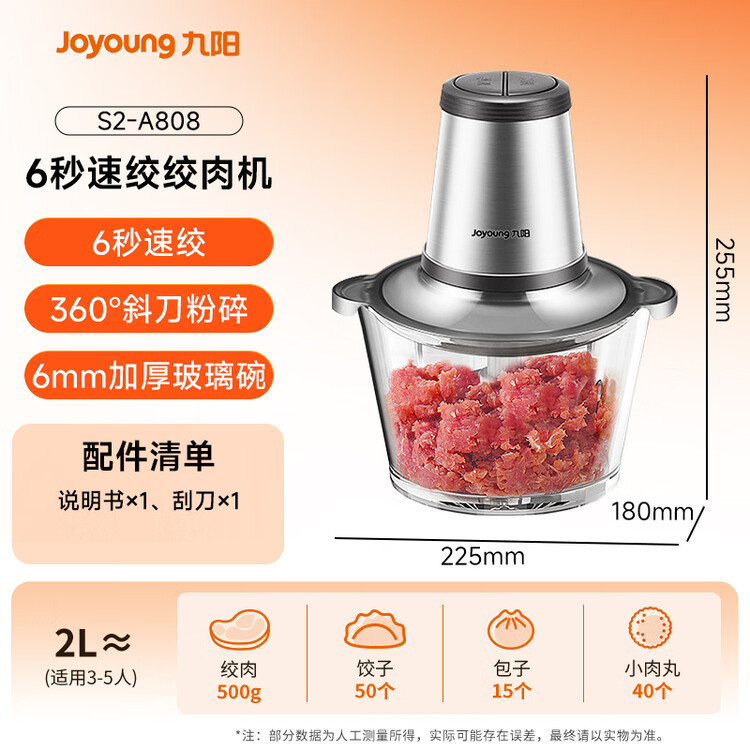 九阳(Joyoung)绞肉机家用2L容量 绞馅机 碎肉机 电动多功能搅拌打肉饺子肉馅机S2-A808