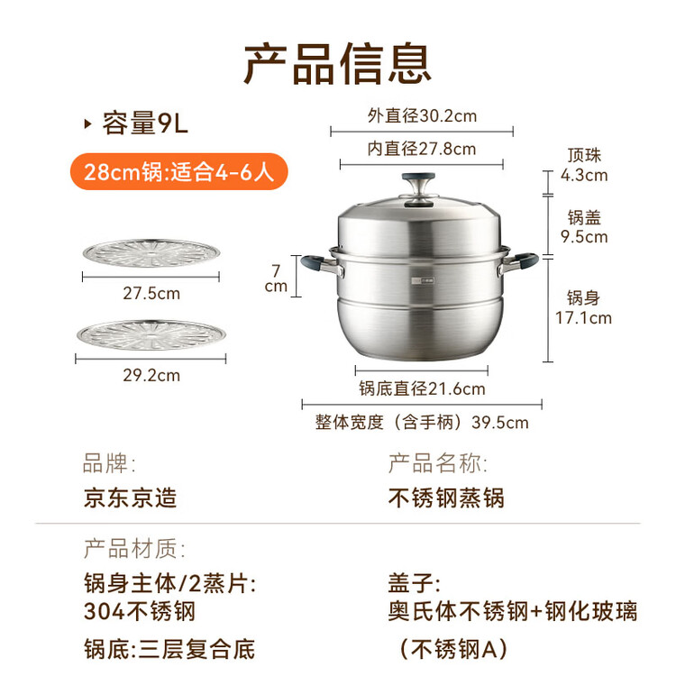 京东京造 蒸锅 大容量304不锈钢汤锅加厚炖蒸煮燃气灶家用 双层28cm