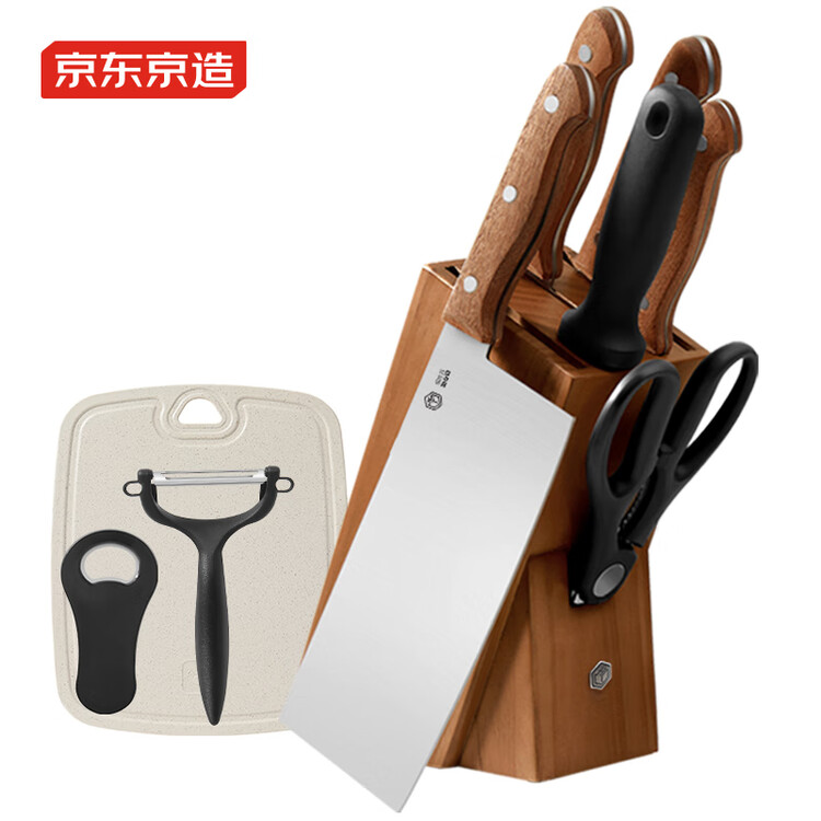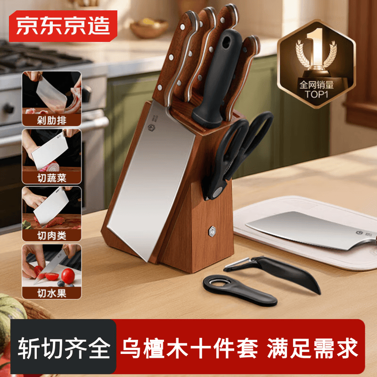 京东直供新 > 厨具 >刀剪菜板 >京东直供 >京东京造 刀具全套 菜刀菜板厨房水果刀砍骨切片套装 乌檀木10件套