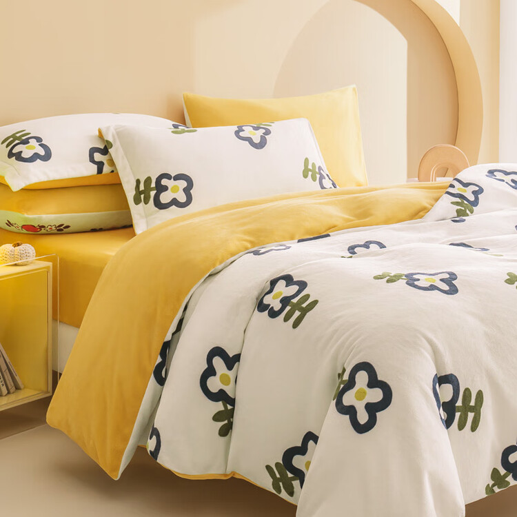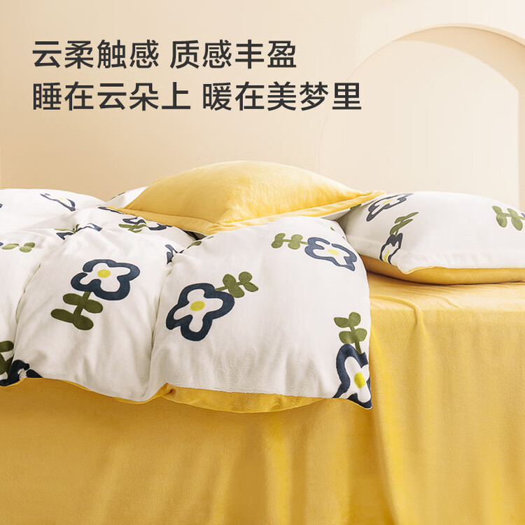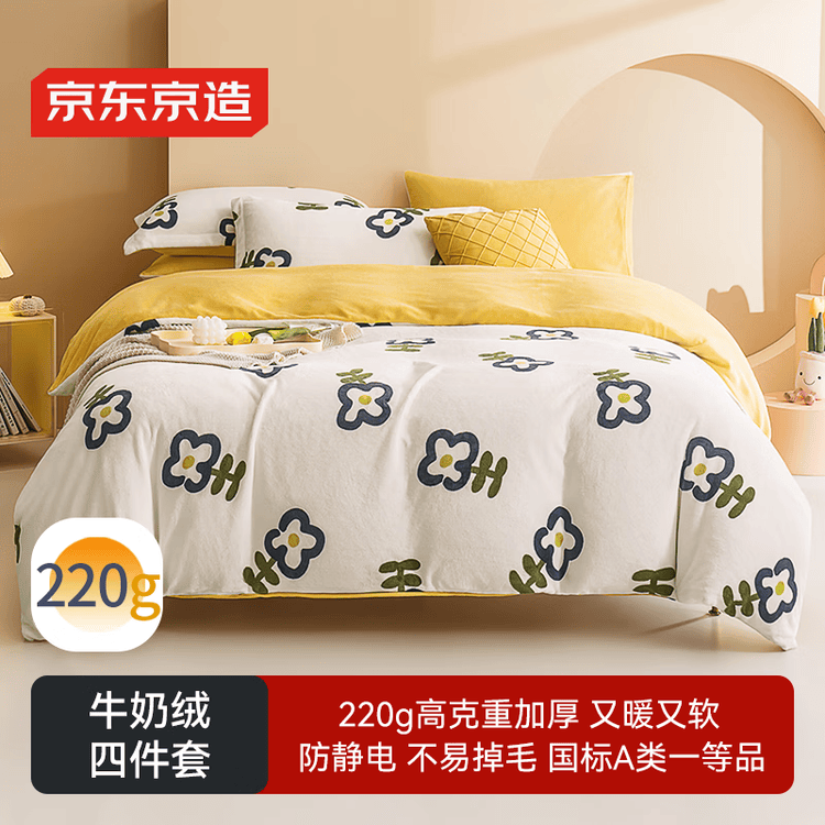 京东京造 220g牛奶绒四件套 A类秋冬加厚高克重法兰绒保暖双人床单枕套被套 1.8米床 牛奶花