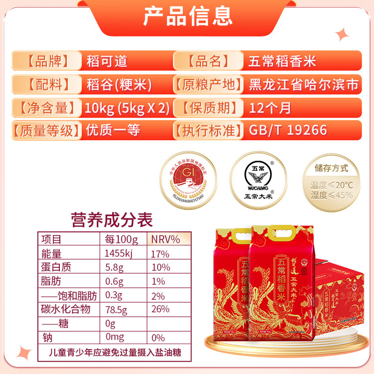 稻可道五常大米礼盒 20斤 五常稻香米10斤*2袋 送礼佳品 当季新米