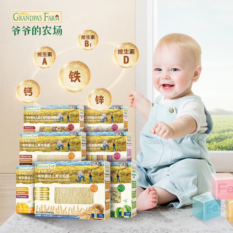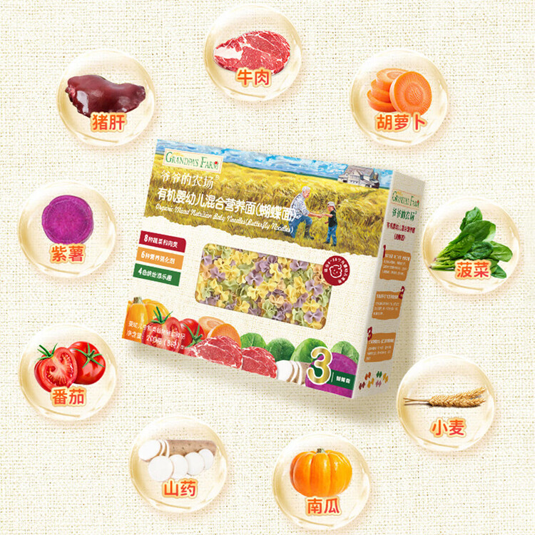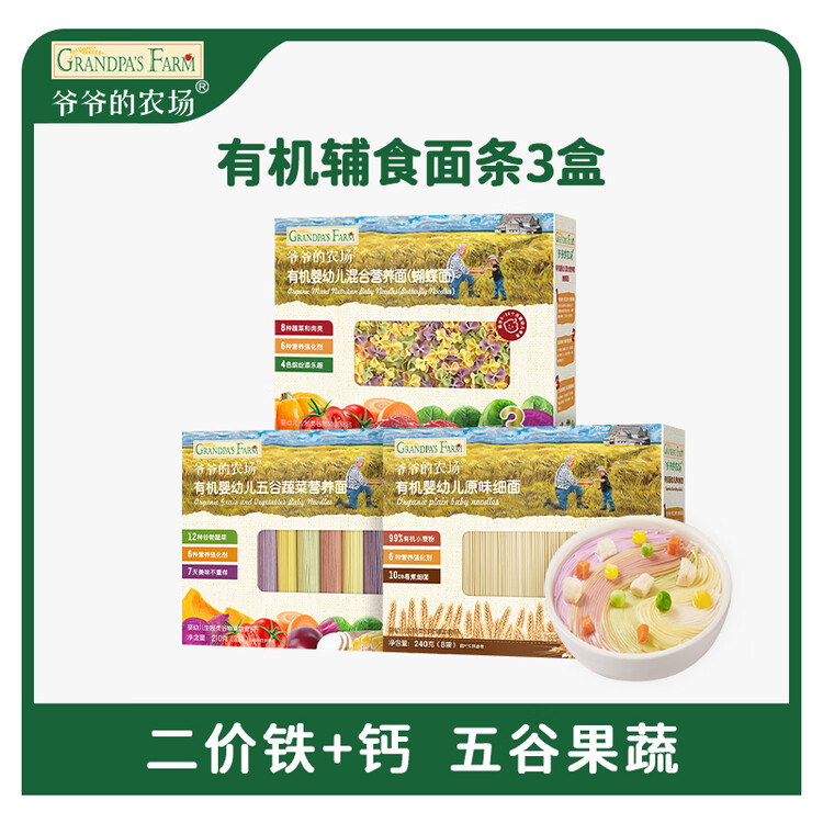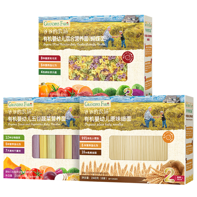 爷爷的农场婴幼儿有机面条宝宝蝴蝶面200g五谷面210g原味细面240g混合3盒装