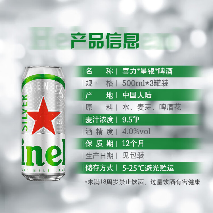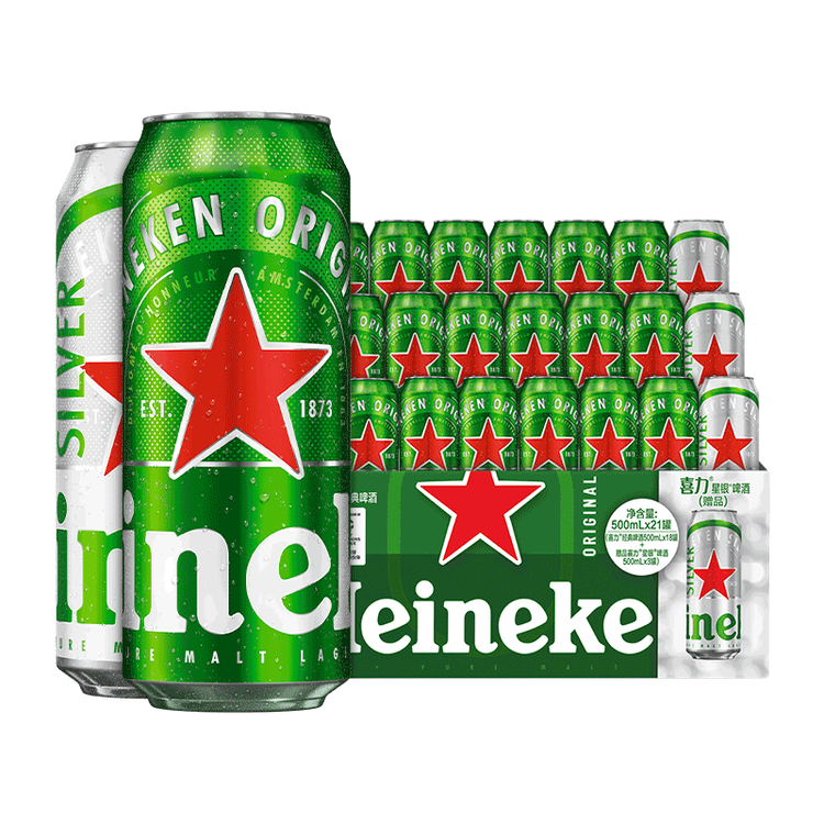 喜力啤酒500ml*21听大罐听装(经典18听+星银3听)婚宴喜酒踏春送礼