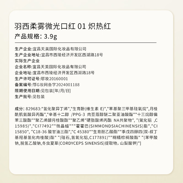 京东直供新 > 美妆护肤 >香水彩妆 >京东直供 >羽西柔雾口红01炽热红雾面显白滋润显气色化妆品生日礼物送女友