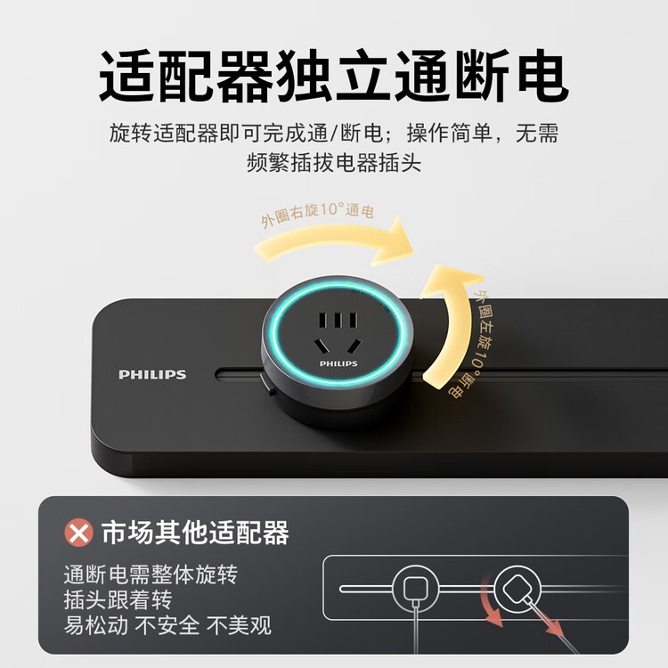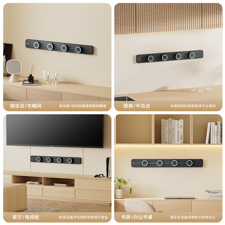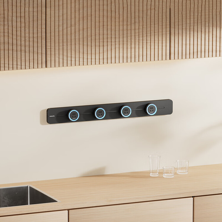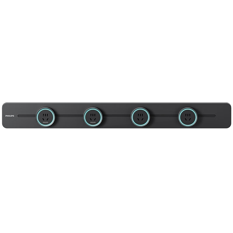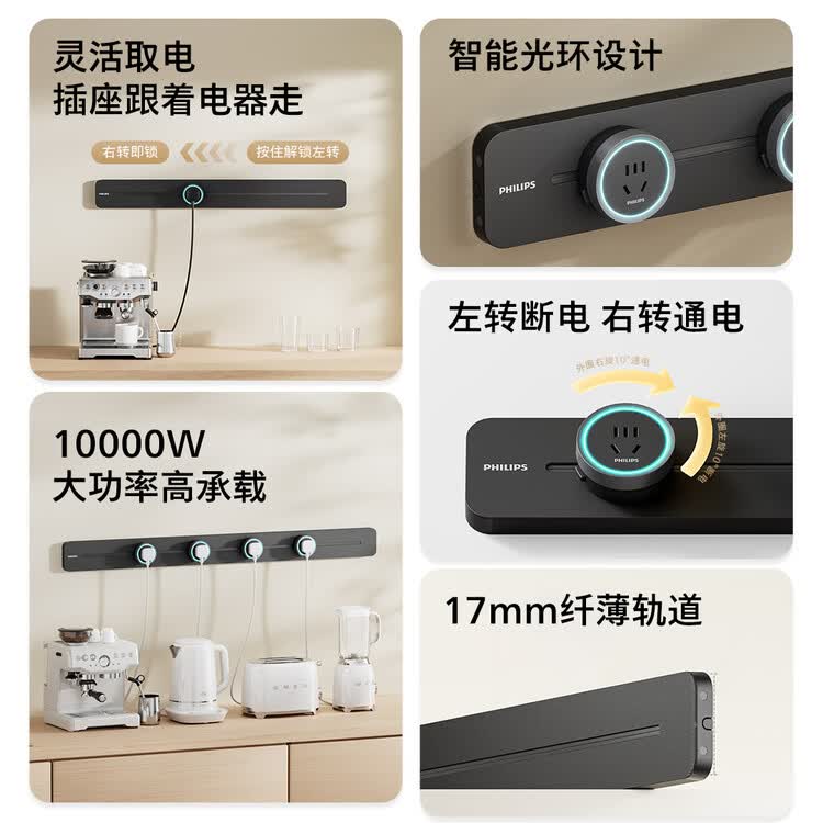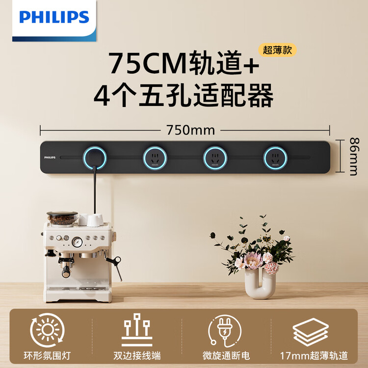 飞利浦(PHILIPS)圆弧轨道插座轻薄氛围灯可移动滑轨排插墙壁挂式无线免开槽餐边柜开关插座面板75厘米+4个适配器黑