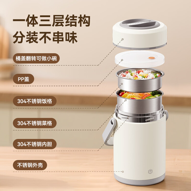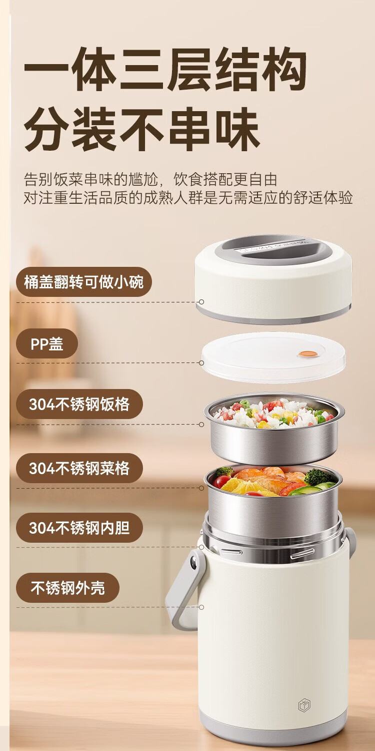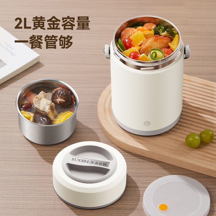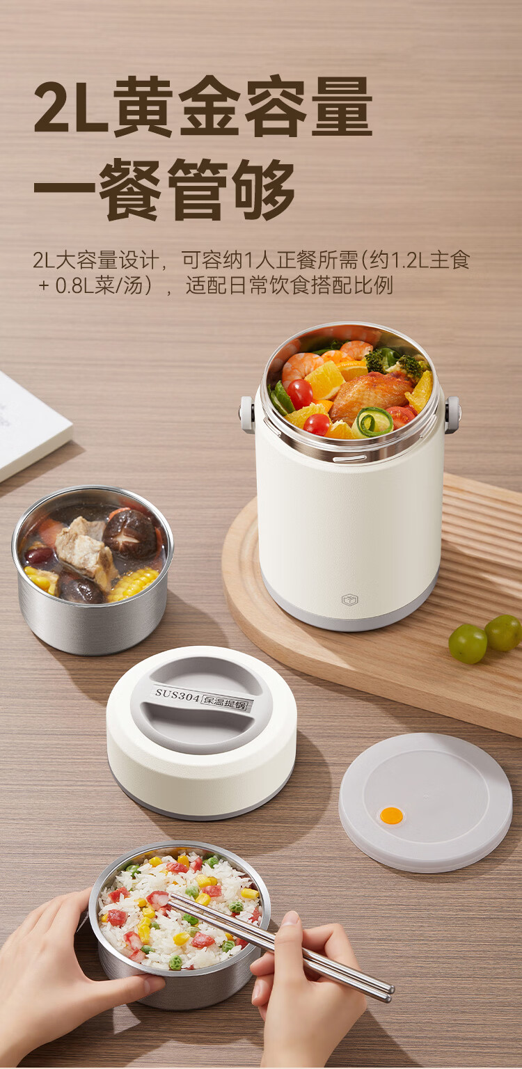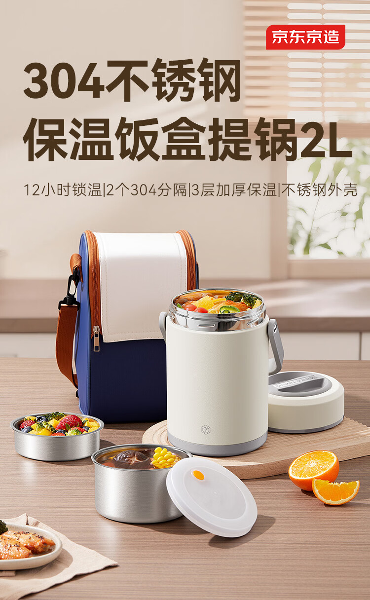 京东京造 保温桶 304不锈钢饭盒上班族小学生带盖餐盒三层2L 配保温袋
