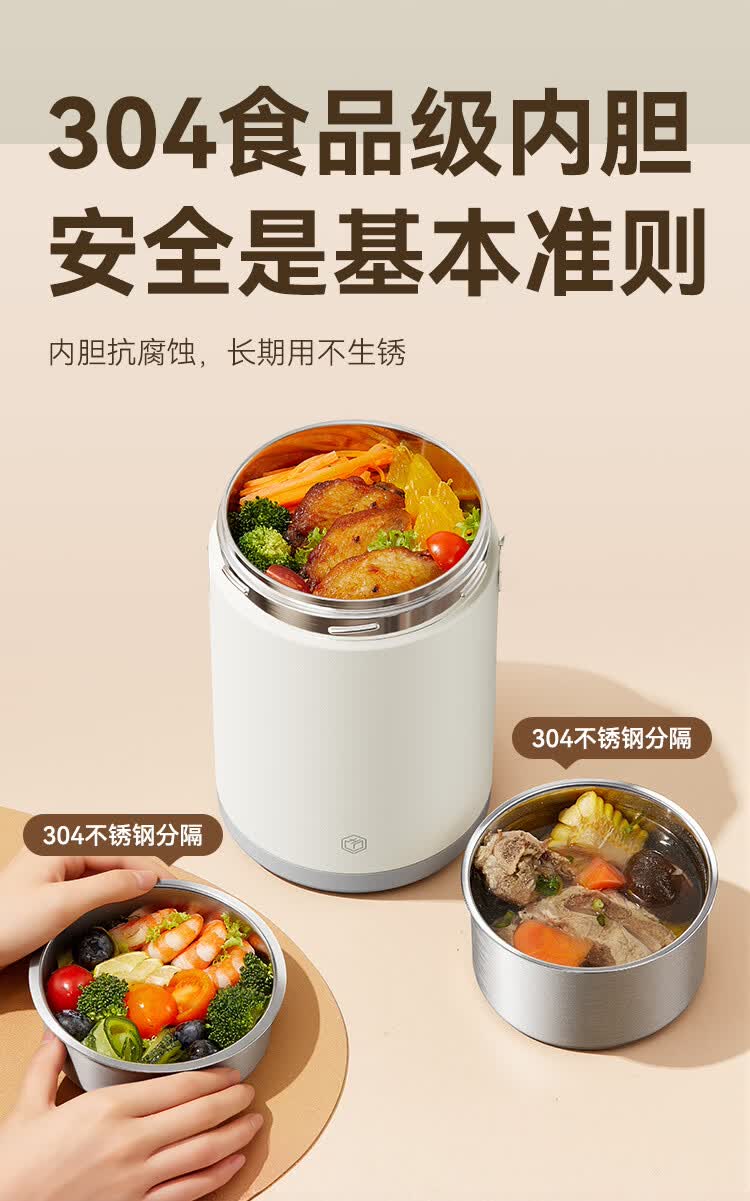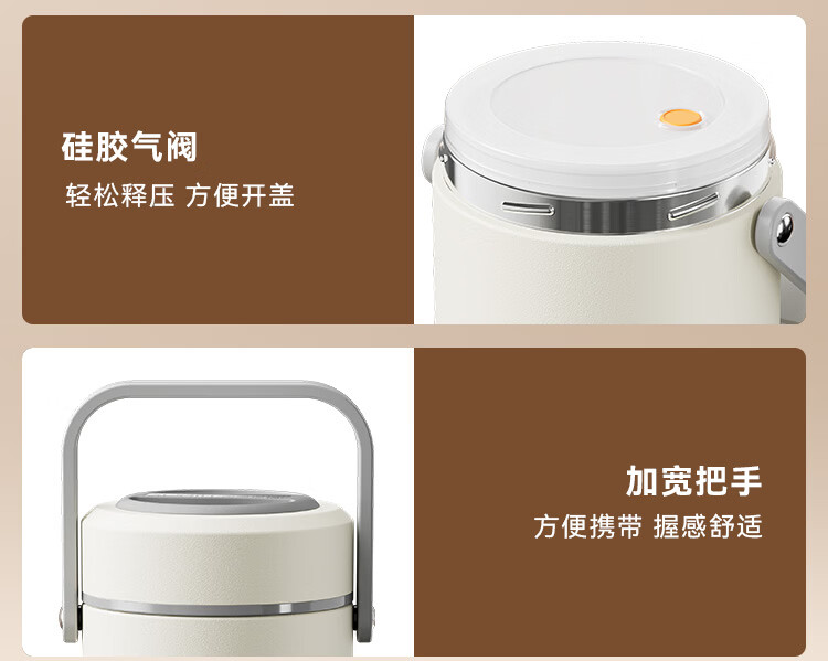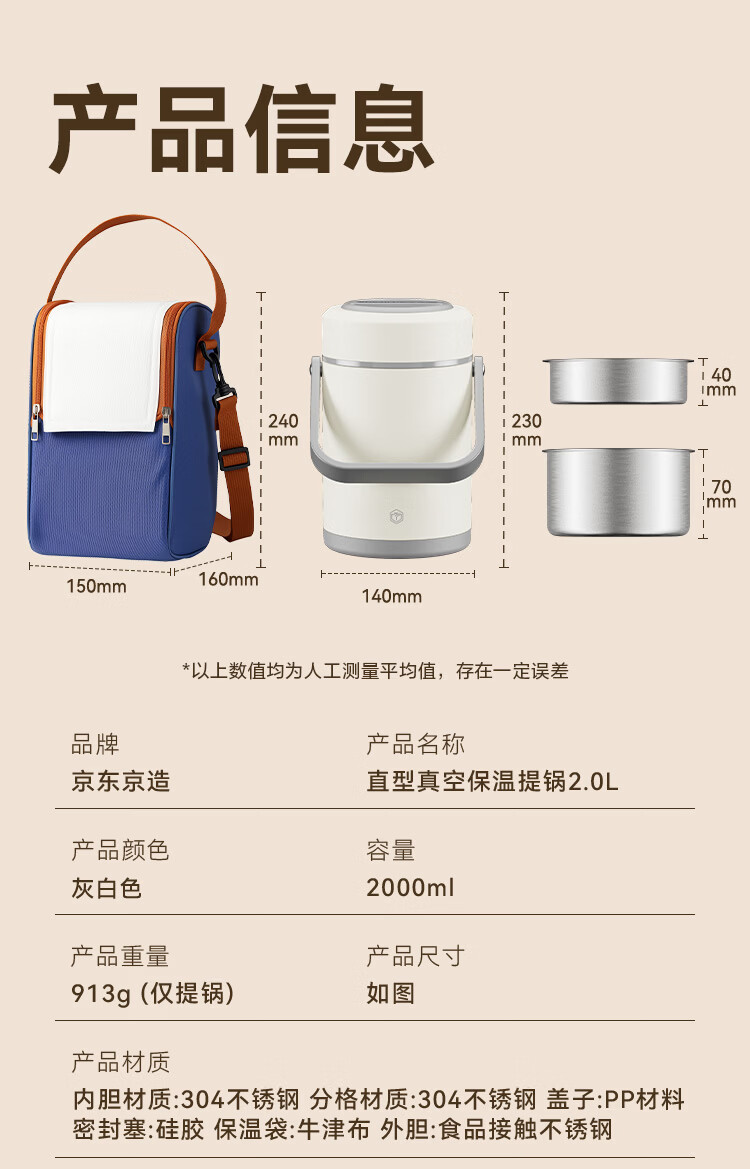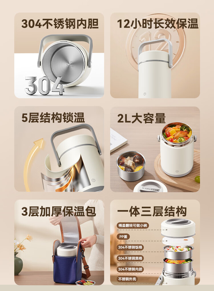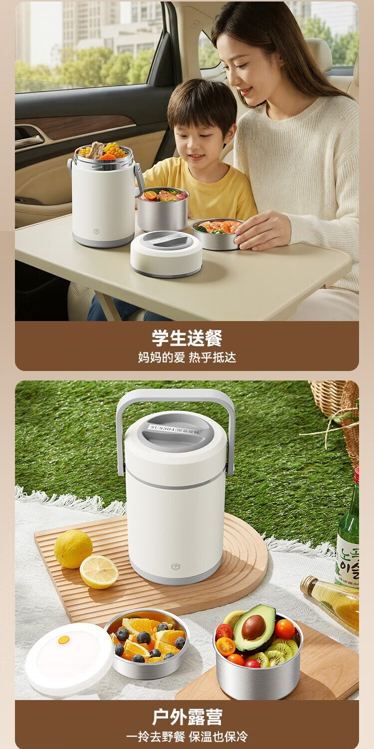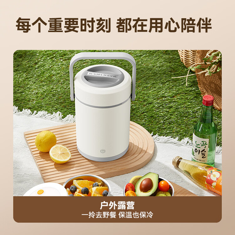 京东京造 保温桶 304不锈钢饭盒上班族小学生带盖餐盒三层2L 配保温袋